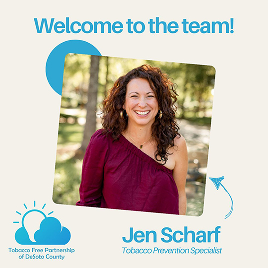 The DeSoto County Tobacco Free Partnership is thrilled to welcome Jen Scharf as the newest member of our team! Jen’s story is deeply rooted right here in DeSoto County. Born and raised in Bulldog Country, she has always believed in the power of connection, service, and helping others live well.